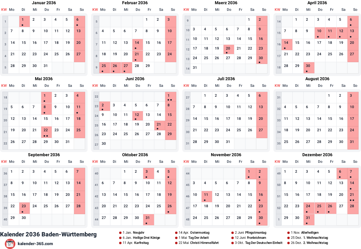 Jahreskalender 2036 für Baden-Württemberg mit 12 gesetzlichen Feiertagen und allen Kalenderwochen. Kostenloser Download als JPG, PNG oder PDF. Regional angepasster Kalender nur mit den für Baden-Württemberg gültigen Feiertagen.