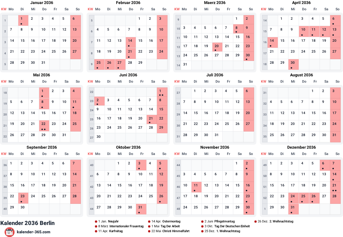 Jahreskalender 2036 für Berlin mit 10 gesetzlichen Feiertagen und allen Kalenderwochen. Kostenloser Download als JPG, PNG oder PDF. Regional angepasster Kalender nur mit den für Berlin gültigen Feiertagen.