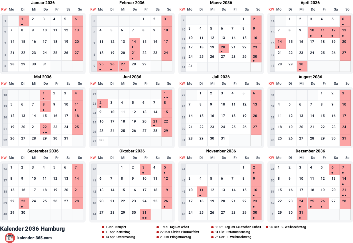 Dieser regionale Kalender 2036 ist speziell für Hamburg erstellt und zeigt nur die dort gültigen10 Feiertage. Die Kalenderwochen folgen dem ISO 8601 Standard und beginnen immer montags. Regional spezifische Feiertage sind entsprechend der Landesgesetze von Hamburg berücksichtigt. Laden Sie den Kalender kostenlos als PDF herunter für Ihre regionale Terminplanung.