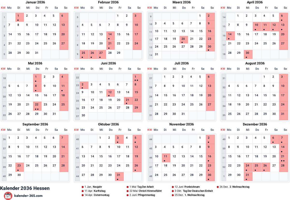 Jahreskalender 2036 für Hessen mit 10 gesetzlichen Feiertagen und allen Kalenderwochen. Kostenloser Download als JPG, PNG oder PDF. Regional angepasster Kalender nur mit den für Hessen gültigen Feiertagen.