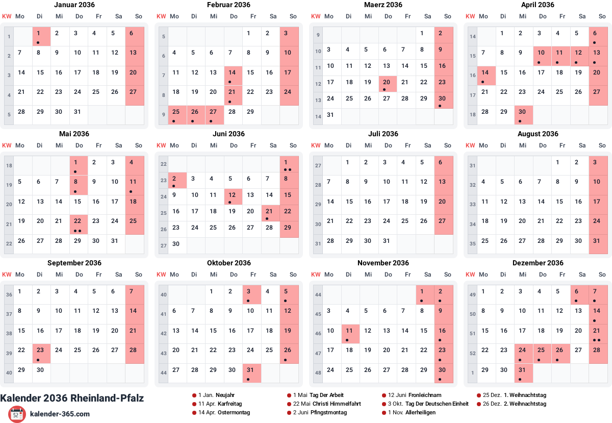 Dieser regionale Kalender 2036 ist speziell für Rheinland-Pfalz erstellt und zeigt nur die dort gültigen11 Feiertage. Die Kalenderwochen folgen dem ISO 8601 Standard und beginnen immer montags. Regional spezifische Feiertage sind entsprechend der Landesgesetze von Rheinland-Pfalz berücksichtigt. Laden Sie den Kalender kostenlos als PDF herunter für Ihre regionale Terminplanung.