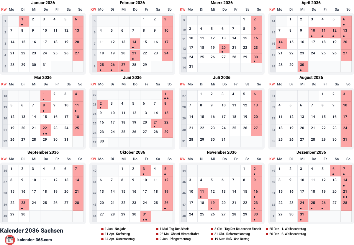 Jahreskalender 2036 für Sachsen mit 11 gesetzlichen Feiertagen und allen Kalenderwochen. Kostenloser Download als JPG, PNG oder PDF. Regional angepasster Kalender nur mit den für Sachsen gültigen Feiertagen.